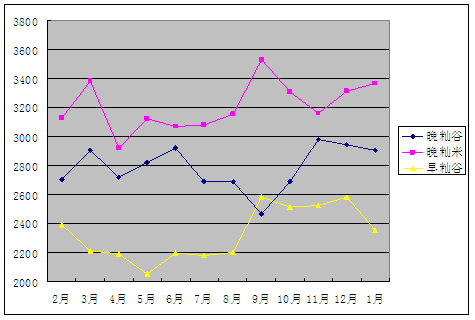 1、晚籼米方面:本月本网晚籼米主体以销售为主,整体价格有小幅上涨。由于随着春节的临近,市场上终端消费将引起一波小高潮,部分地区价格将会有一定程度的上涨。预计后期晚籼米价格将以稳为主,部分地区会有小幅上涨。