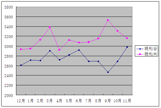 2、中晚籼稻方面:本月本网中晚籼稻市场价格继续维持在较高价位运行,价格与上月相比有所上涨。11月份中晚籼稻托市大面积展开,国内稻谷市场价格将依旧围绕国家托市价格运行,政策市将是后一时期稻米市场的主要特征。预计后期,在托市政策托底下,国内稻谷市场将维持稳中趋强态势。