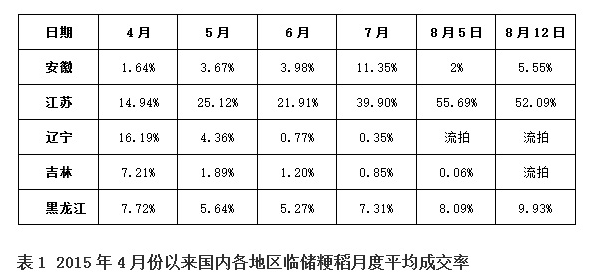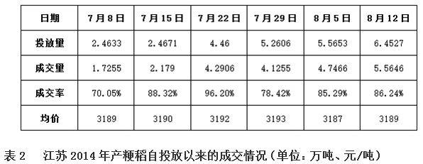 自5月以来,江苏市场粳稻流通量不足其实已经开始凸显,当时国储拍卖主要对象为2013年产粳稻,而米厂采购2014年产的粳稻的意愿较高;市场流通量的不足,对中小米厂的采购造成了较大困扰,部分米厂为了保证开工不得不加价收购优质2014年产粳稻,对市场价格有一定的推动作用。自7月8日起,江苏2014年产临储粳稻开始投放市场,市场竞拍热情明显提高,成交率最高更是达到九成以上(表2)。至8月12日,江苏2014年产粳稻共投放26.669万吨,实际成交22.6318万吨。