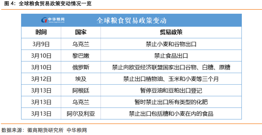 目前俄乌局势仍然焦灼,战争对粮食市场的影响还在加深。部分国家开始收紧出口政策,粮食进口国面临供应短缺压力,粮食价格震荡不安。对比2020年年初的全球原粮出口国的出口政策,本次涉及的国家更多,牵涉的农产品品种更广,因当时只有疫情的天灾,而本次还新增了战争的因素。2020年年各国只是提升了部分农产品关税,且设置了时间节点,但本次就是干脆宣布停止本国的农产品出口。