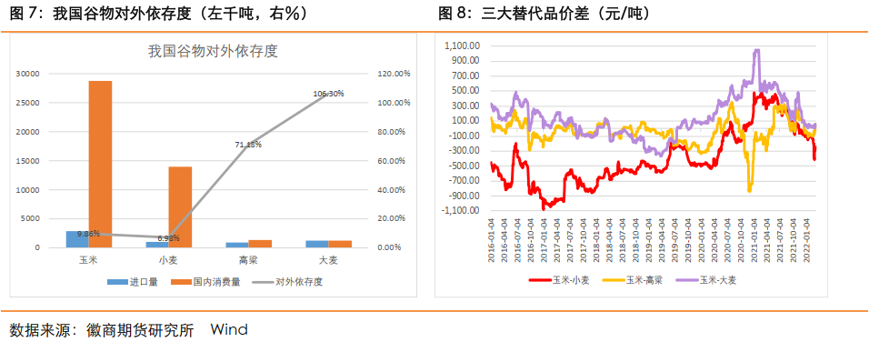 对于高粱和大麦,虽然进口依存度较高,但高粱进口主要来源国为美国、阿根廷和澳大利亚,而大麦的进口主要来源国是法国、加拿大、乌克兰和阿根廷,其中乌克兰进口量为321.41万吨,占国内总消费的27.31%。我国大麦供给未来有望转而其他国家。
