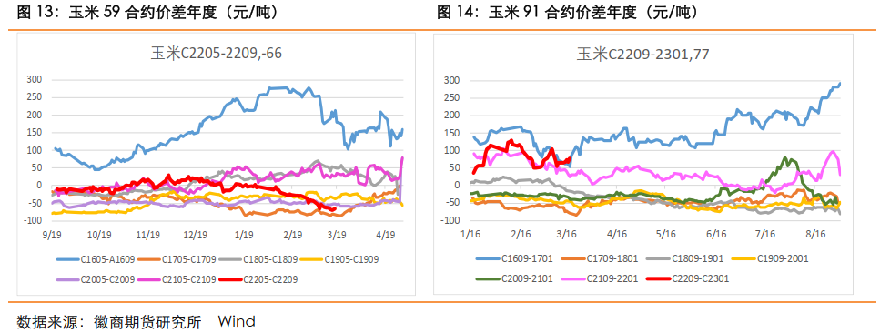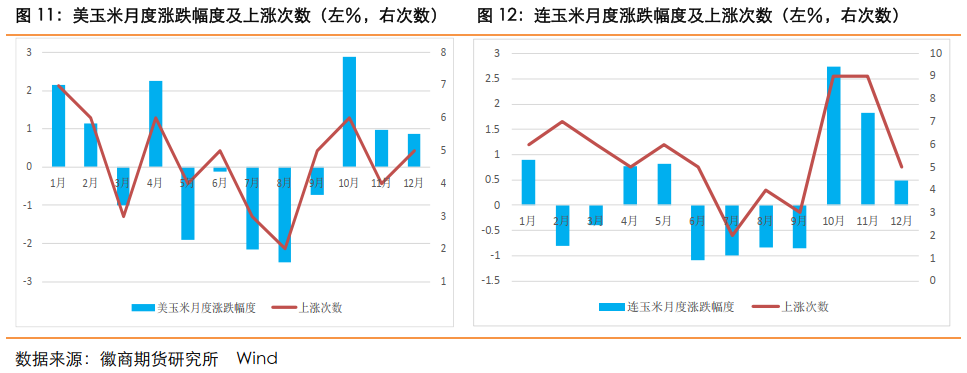 跌幅来看,CBOT玉米全年下跌次数最多和平均跌幅最大的都是8月的8次和2.49%,而连玉米下跌次数最多是7月的8次,平均跌幅最大的却是6月的-1.08%。原因是国际上新作玉米9月上市,8月的提前反应;而国内玉米6~8月基本是国储陈玉米轮换拍卖,大量供应市场的时间节点。