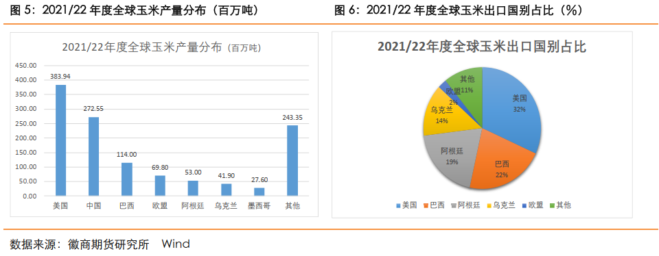 从全球玉米的产能分布和出口情况来看,产量前三名为美国、中国和巴西,中国基本自己给自足,出口很少,而阿根廷和乌克兰虽然产量占比不高,但由于出口量大,因而在全球出口贸易中占第三和第四位,USDA三月报告数据显示,乌克兰2021/22年度乌克兰玉米产量4190万吨,出口预计为2750万吨,占据全球总出口的14%。