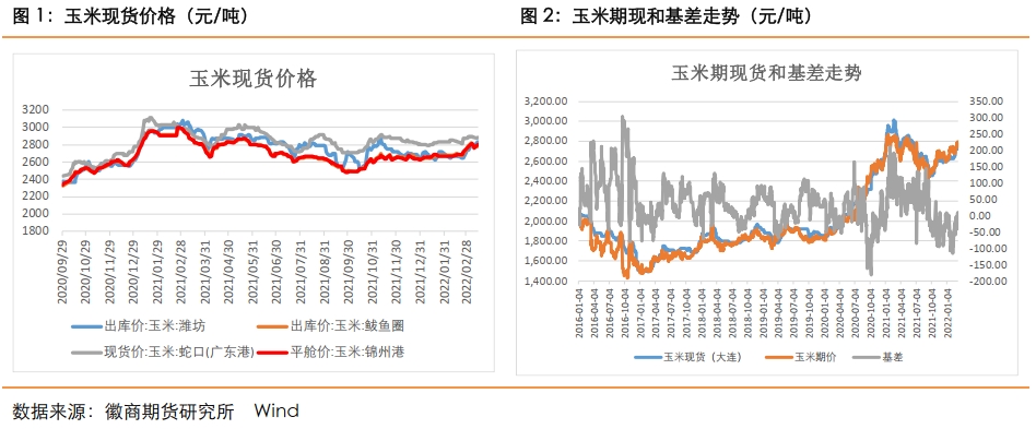2022年3月以来,供应方面,随着气温回升,玉米主产区基层潮粮出货积极性增加,基层种植户余粮目前基本只有三到四成左右。其中东北地区平均售粮进度已过七成(黑龙江售粮进度81%,吉林81%,辽宁73%,内蒙古78%),与去年同期基本持平;华北地区售粮进度已过六成(其中山东68%,河北近61%,河南69%),低于去年同期约10个百分点左右。目前华北地区售粮进度依然较去年偏慢,但目前现货高位运行,地趴粮的销售难度得到缓解。