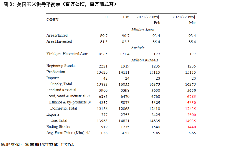 而美国3月的供需平衡表中,将2021/22年度美国玉米乙醇消费用量调增了0.25亿蒲至53.5亿蒲,美国玉米出口量也上调了0.75亿蒲至25亿蒲,因而美国玉米结转库存从2月报告中的15.40亿蒲下降至3月的14.40亿蒲,低于此前市场预估的14.79亿蒲。总的来看,3月报告中全球玉米消费增加的增幅高于出口量下滑的部分,因而全球玉米库存较2月下调了125万吨至3.0097亿吨,因而本次报告数据为中性偏利多,虽然俄乌冲突有缓解的迹象,但在战争仍有可能影响新季玉米春播的预期之下,美玉米回落空间受限。