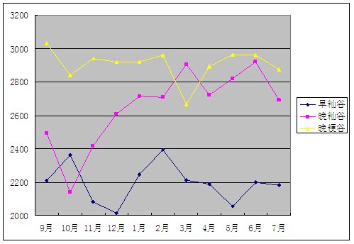 7月份本网交易主要以早籼谷、晚籼谷、晚粳谷销售交易为主,宁波粮网交易以晚粳谷销售交易为主,杭州粮网主要以晚粳谷销售交易为主。本网交易量与去年同期相比增加了76.53%。本网稻米交易价格主要以稳中小幅下跌的态势运行,预计后期价格将以稳为主。