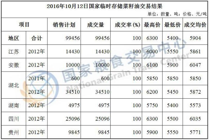 12日,国家重启中断4个月的临储菜油拍卖,本次拍卖已于北京时间12日中午结束,整体成交情况如下表: