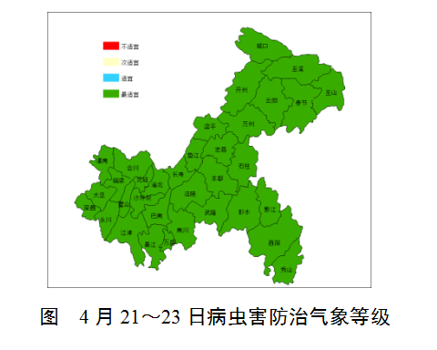利用降水与气温预报结论,根据模型计算:4月21~23日,我市各地病虫害防治气象等级均为最适宜(见下图)。
